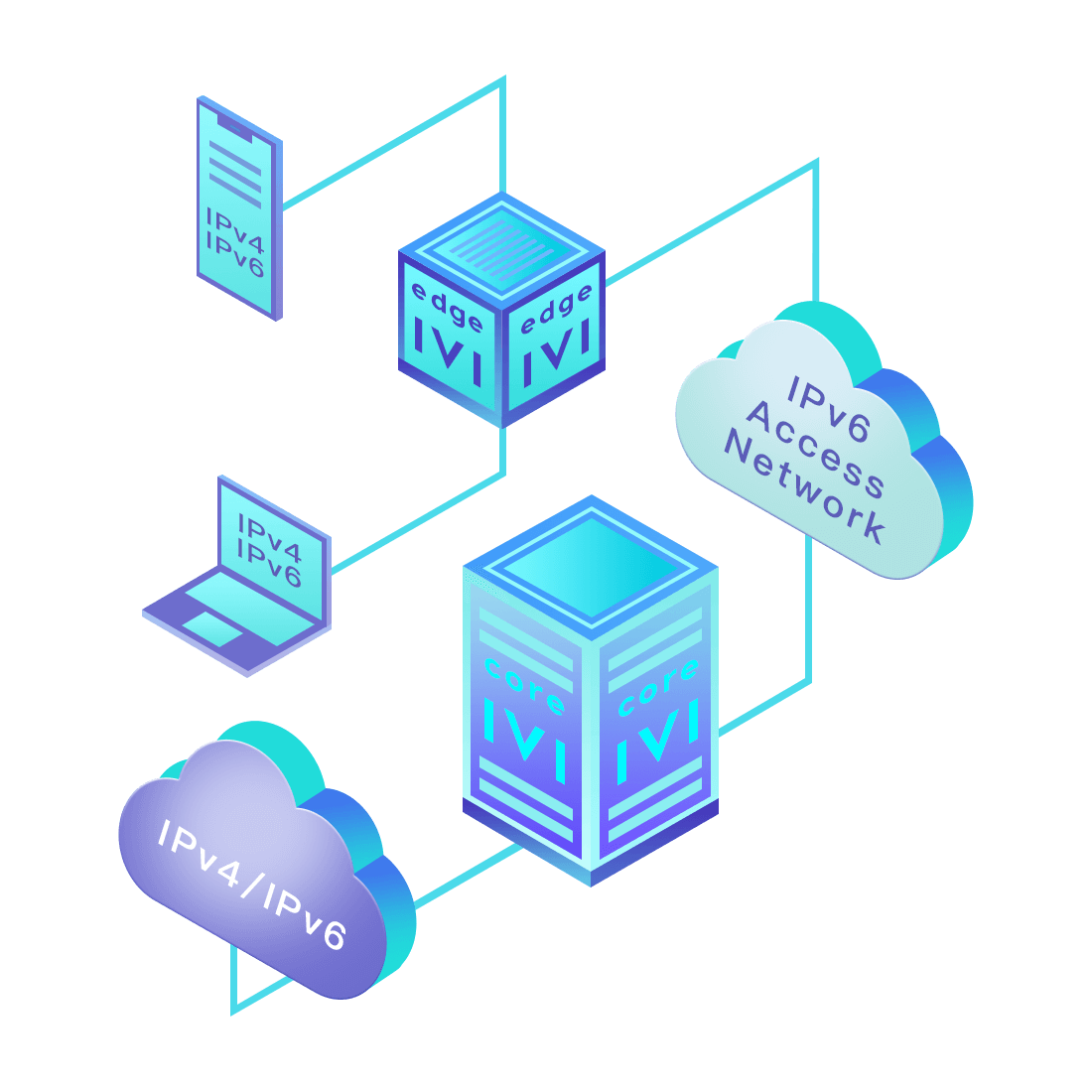 對(duì)正在進(jìn)行IPv6整體升級(jí)規(guī)劃的運(yùn)營(yíng)商,應(yīng)用IPv6升級(jí)方案2.5,通過IVI無狀態(tài)翻譯技術(shù)和純IPv6接入網(wǎng)絡(luò),為雙棧客戶端和雙棧服務(wù)器提供連通服務(wù)。